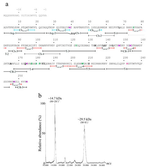 Finally, the quinoin sequence accounted for a calculated molecular mass of 28,766.1 Da, which was in agreement with the value obtained by MALDI-TOF mass spectrometry on the native protein (~29.5 kDa; Figure 2b), taking into account the heterogeneity due to the presence of the glycan chains moiety on Asn231.