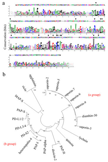 - Di Maro, A.; Citores, L.; Russo, R.; Iglesias, R.; Ferreras, J.M. Sequence comparison and phylogenetic analysis by the Maximum Likelihood method of ribosome-inactivating proteins from angiosperms. Plant Mol. Biol. 2014, 85, 575–588. [Google Scholar] [CrossRef] [PubMed]