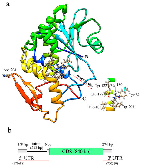In this framework, with information on the genome of C. quinoa, [23] and, in particular, on the genomic sequence coding for quinoin (A.C.: NW_018745569.1 in Gene Bank), we decided to investigate this region through a bioinformatics approach. The gene model coding for quinoin is shown in Figure 4b. The open reading frame (ORF) of quinoin was annotated as a single exon of 840 bp (Figure S5), while the gene model revealed an intron within the 5′ UTR (~233 bp). This model was similar to the gene models retrieved for the PAP isoforms. Therefore, the gene organization suggested that quinoin protein expression could be subjected to particular gene regulation in biotic and abiotic stresses given the presence of the 5′ UTR region of both the intron and the leader intron [41].