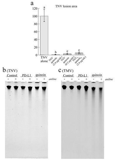 Thus, we investigated the possible antiviral action of quinoin against TNV, which affects numerous cultivated plants. In a preliminary experiment, quinoin was tested at 2.0 and 10 µg/mL (70 and 350 nM), concentrations that had previously been shown to be effective in the case of PD-L1 and PD-L4, two type 1 RIPs from the leaves of P. dioica [16]. At both concentrations, quinoin completely abolished the TNV infection when inoculated together with the virus suspension in the same leaf surface (data not shown). On the basis of this result, quinoin was tested at 2.0 and 0.2 µg/mL (70 and 7 nM) in three independent experiments which showed that the most diluted solution was able to greatly reduce the virus infection (−96.88%) when mixed with the virus inoculum (Figure 5a and Figure S6). Again, the concentration of 2.0 µg/mL almost completely abolished the infection as assessed by the very few and small lesions (−99.99 total infected area) in respect to the plants inoculated only with the virus suspension in water (Figure 5a and Figure S6).