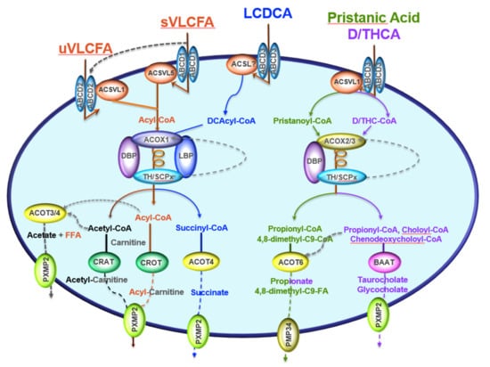 Peroxisomal β-oxidation pathways, including different enzymes and transporters. Saturated or unsaturated very-long-chain fatty acids (sVLCFA or uVLCFA) are imported by the solute ABC-transporters ABCD1 and ABCD2, respectively, into peroxisome, where they are transformed into their acyl-CoAs by one of the peroxisomal acyl-CoA synthetases (ACSVL5 for uVLCFA, and ACSVL1 for uVLCFA). The long-chain dicarboxylic acids (LCDCA), originating from the endoplasmic reticulum ω-oxidation, are imported by ABCD3 and activated to their acyl-CoA thioesters (DCAcyl-CoA) by an unknown acyl-CoA synthetase (ACSL?). The reactions that are catalyzed by ACSVL and ACSL use CoASH and hydrolyze ATP to AMP and pyrophosphate to activate VLCFA or LCDCA molecules, giving acyl-CoA. Acyl-CoA oxidase 1 (ACOX1) is the first flavoenzyme in the straight-chain β-oxidation system, oxidizing sVLCFA, uVLCFA, or LCDCA to their enoyl-CoA derivatives. The second enzyme metabolizing sVLCFA and uVLCFA is the D-bifunctional protein (also called MFP2 or HSD4B17), while the dicarboxylic enoyl-CoA are taken by the L-bifunctional enzyme (also called MFP1 or EHHADH). The thiolytic cleavage is catalyzed by one of the two peroxisomal thiolases (TH: thiolase/ACAA1/2 or SCPx: sterol carrier protein-x). After several rounds of β-oxidation, the peroxisomal system gives shortened acyl-CoA derivatives as hexanoyl- or octanoyl-CoA, and one molecule of acetyl-CoA/round. Both shortened acyl-CoA and acetyl-CoA can be hydrolyzed by acyl-CoA thioesterases 3 or 4 (ACOT3/4) to CoASH, while free fatty acid and acetate are exported by the pore-forming protein PXMP2 (or PMP22) to the cytosol. However, acetyl-CoA and acyl-CoA derivatives can also be transformed to acetyl-carnitine or acyl-carnitine by carnitine acetyl- and carnitine octanoyl transferases (CRAT and CROT), respectively, and then exported by PXMP2 to the cytosol. β-oxidation of DCAcyl-CoAs leads to the production of succinyl-CoA, hydrolyzed to succinate and CoASH by ACOT4, and shipped outside by peroxisome PXMP2. Bile acid intermediates, dihydroxycholestanoic acid (DHCA) and trihydroxycholestanoic acid (THCA), imported by ABCD3 transporter, are beta-oxidized by ACOX2, DBP and SCPx enzymes, leading to the formation of choloyl-CoA and chenodeoxycholoyl-CoA, which are conjugated to glycine or taurine by the bile acid-CoA: amino acid N- acyltransferase (BAAT) and then exported by PXMP2. D/THC-CoA indicate DHCA and THCA co-enzyme A thioesters.