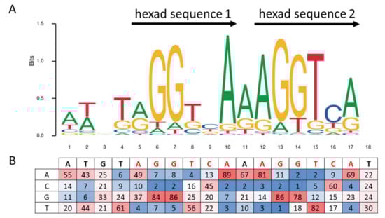 Sequence logo and consensus matrix of the PPARα/RXRα PPRE consensus sequence from MA1148.1 Jaspar matrix []. (A) Sequence logo of the MA1148.1 Jaspar matrix, presenting the conservation of nucleotides from multiple alignments of 1000 PPARα/RXRα PPRE sequences. Adenosine (A), cytidine (C), guanosine (G), and thymidine (T) nucleotides are respectively green-, blue-, yellow-, and red-colored, and the relative size of the letters represents their frequency in the consensus. The total height of a logo position corresponds to the degree of conservation in the corresponding multiple sequence alignment. (B) A table representing the percentage of the four bases for each position of the consensus. The color gradient code highlights the percentage of conservation of bases from blue to red for the whole table.