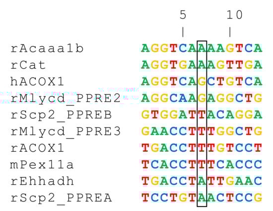 Among the hundreds of genes known to be regulated by PPARα, eight are encoding enzymes that are commonly localized in the peroxisomal compartment (Figure 3), and belong to the three species: human, mouse, and rat. Table 1 presents validated PPREs sequences for functional genes, of which four (Acox1, Ehhadh, Acaa1b, and Scp2) are encoding very-long-chain fatty acid β-oxidation enzymes, and the remaining genes are Cat, encoding the catalase enzyme, and Mlycd (malonyl-CoA decarboxylase gene), expressing an enzyme with both cytoplasmic and peroxisomal localization. The latter form is believed to be involved in the peroxisomal degradation of malonyl-CoA produced by odd-chain-length dicarboxylic fatty acid β-oxidation [], and finally, the Pex11a gene, which participates particularly in peroxisome biogenesis (Pex11α).