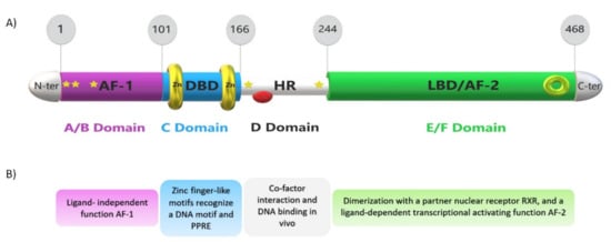 Peroxisome proliferator-activated receptors (PPARs) are ligand-regulated transcription factors and belong to a nuclear steroid/thyroid hormone receptor superfamily []. Their name originates from their property of peroxisome proliferation []. Three PPAR isoforms have been first isolated from the mouse [], then Xenopus [,,], then rat [] and human [], including PPARα (NR1C1), PPARβ/δ (NUC1, NR1C2) and PPARγ (NR1C3). Human PPARα protein consists of 468 amino acid residues, while PPARβ/δ has 441, and PPARγ, 479 aminoacyls long []. Each is characterized by a distinct tissue expression profile, a definite ligand binding specificity, and a set of functions implicated in carbohydrate-lipid metabolism, cancer, inflammation, cell proliferation, and differentiation [,,,]. To sustain their protein stability and transcriptional activity, PPARs are subjected to post-translational modifications, such as phosphorylation [], SUMOylation [], and ubiquitylation []. PPARs act altogether in harmony, to maintain and control cellular and whole-body energy homeostasis by modulating the expression of their specific target genes [].
