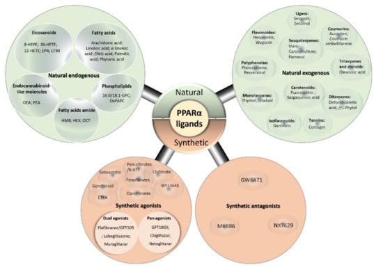 Evidence indicates that a wide variety of lipophilic molecules, the so-called ligands, can activate PPARα, encompassing natural saturated, unsaturated, and polyunsaturated fatty acids (PUFAs) [,], and synthetic ligands that are collectively referred to as PPARα-activators [].