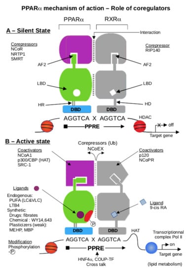 Scheme of heterodimer PPARα/RXRα, located on a PPRE DNA region. The graphic displays two parts: part (A), the silent state, and part (B), the active state. Part (A). In the absence of the ligand, PPARα interacts with transcriptional corepressors (NCoR, SMRT, NRTR-P-1) by recognizing the AF2 region. The same process is at the RXR, where AF2 interacts with RIP140 as RXRα corepressor []. Due to the chromatin condensed state, the heterodimer cannot bind the PPRE properly. Part (B). In the presence of a PPARα ligand, either a long-chain or very-long-chain polyunsaturated fatty acid, leukotriene LTB4, fibrate or other chemicals [], and a 9-cis retinoic acid as RXRα ligand, an exchange corepressor/coactivator is made by NCoEX, which suppresses the repressive of corepressor state by ubiquitinylation-inducing degradation by the proteasome system. The fixation of a ligand induces an allosteric LBD conformational change of AF2, allowing the recruitment of coactivators, either NCoR1, p300/CBP, or SRC1 for PPARα, and p120 and NCoPR for RXRα []. The CBP-dependent HAT activity induces the remodeling of chromatin and allows the PPARα/RXRα heterodimer to bind to PPRE correctly, then activates the Pol II transcription complex and triggers the transcription of lipid metabolism-encoding genes. Some post-translational modifications of PPARα regulate its activity [,]. For instance, phosphorylation stimulates PPARα transcriptional activity []. The HNF4α transcription factor recognizes a similar response element as the PPRE and interplay with PPARα []. A comparable mechanism has been reported with the Coup-TF transcription factor. While several works consider PGC-1α [] as an important coregulator of PPARα, it seems to be more specific for PPAR γ. The 15(S)-HETE, 15-hydroxyicosatetraenoic acid, family of arachidonic acid metabolites; 9-cisRA, retinoic acid cis conformation in carbon 9; AF1, activating domain 1; AF2, activating domain 2; CBP, CREBP binding protein; CoPRs, COPR1 and COPR2 as corepressors of PPAR and RXR, respectively; COUP-TF, chicken ovalbumin upstream promoter transcription factor; CTBP-2, C-terminal binding protein-2; DBD, DNA binding domain; HAT, histone acetyl-transferase; HD, hinge domain; HNF-4α, hepatic nuclear factor 4 α; HDAC, histone de-acetyl transferase; LBD, ligand binding domain; LTB4, leukotrien B4; MBP, mono butyl phthalate; MEHP, mono ethyl hexyl phthalate; NCoA1, nuclear receptor coactivator 1; NCoEX, nuclear receptor corepressor Excit; NCoR1, nuclear receptor corepressor 1; NRTP-1, nuclear repressor transcription factor; p120, protein 120 kDa; p300, protein 300 kDa; Pol II, RNA polymerase class II; PGC-1αPPAR γ co-activator-1α; PPRE, peroxisome proliferator response element; PRIP/RAP250, PPAR interacting-protein methyl transferase; PUFA (LC &VLC), polyunsaturated fatty acids (long-chain or very-long-chain); RIP140 receptor interacting protein corepressor; SMRT, silencing mediator of retinoid and thyroid receptors; SRC1, steroid receptor coactivator-1.