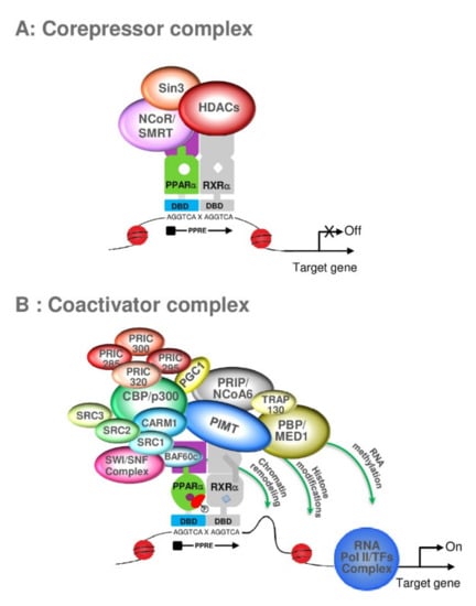 Interaction of PPARα-RXRα heterodimer with corepressor complex (A) or coactivator complex (B). (A) The corepressor complex, including Sin 3, NCoR/SMRT, and HDAC proteins, is recruited to an unliganded PPARα-RXRα heterodimer, so there is no transcription of the PPARα-target genes. (B) in the presence of PPARα-ligand, the PPARα-RXRα heterodimer exhibits a conformational change, leading to the dissociation of the corepressor complex, the recruitment of coactivator proteins, and the binding of PPARα to the peroxisome proliferator response element (PPRE). Different subcomplex modules participate in chromatin remodeling, through the acetylation (SRCs, p300) and the methylation (CARM1) of nucleosomes. Mediator components interact with PPARα and promote the recruitment of the basal transcription factors (TFs) to establish a connection with the RNA polymerase II to transcription of PPARα-target genes.