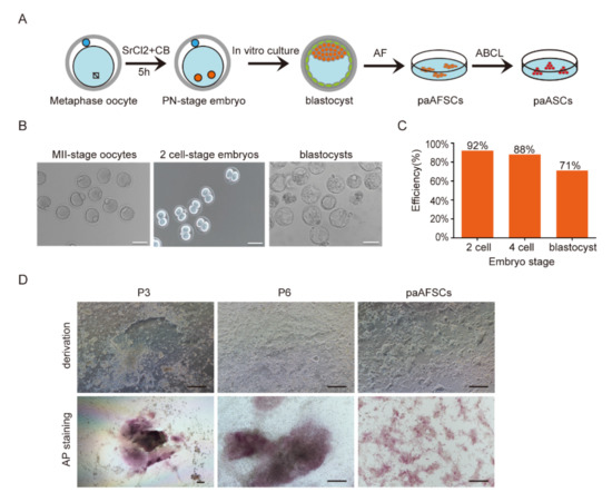 Parthenogenetic diploid blastocysts were collected and zona pellucida were digested via treatment with Tyrode’s acid, and then they were cultured in a 5% AFR (activin A, bFGF, and 5% KSR in N2B27) medium. After 5–8 days, the flat colonies were cut into small pieces and transferred to a fresh 2% AFR (activin A, bFGF, and 2% KSR in N2B27) medium, and the developed colonies were cut and transferred to a 1% AFR (activin A, bFGF, and 1% KSR in N2B27) medium over 10–12 days. We twice repeated this manipulation of the colonies in the 1% AFR medium and replaced it with an AF medium. The paAFSCs were derived and could self-renew for 30 passages using Accutase at a ratio of 1:3–1:5 for two days. Next, we transferred paAFSCs from the AF medium to the ABCL medium, and we found that domed colonies appeared in 3–4 days. These colonies were picked and cut into smaller pieces using glass needle, and then they were transferred to a fresh ABCL medium. When these colonies had grown for 6–7 days, they were treated with Accutase (Gibco, Gaithersburg, MD, USA), and the resulting cells were capable of self-renewal for over 30 passages and named paASCs. The AF medium consisted of an N2B27 medium supplemented with 20 ng/μL of activin A (R&D Systems, Minneapolis, MN, USA) and 12 ng/μL of bFGF (R&D Systems). The ABCL medium consisted of an N2B27 medium with 20 ng/μL of activin A, 50 ng/μL of BMP4 (R&D Systems), 3 μM of CHIR99021, and 1000 IU/mL of LIF (Millipore). All using plates were coated by fibronectin (1 mg/mL in PBS; Millipore) at least 0.5 h before use.