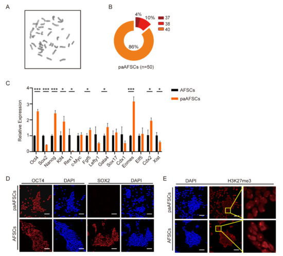 Characteristics of paAFSCs: (A) Karyotype of paAFSCs. (B) Distribution of paAFSCs with different chromosome numbers; n = 50. The cells with a normal karyotype accounted for 86% in paAFSCs. (C) RT-qPCR of key pluripotent genes, germ-layer-related genes, and X-chromosome-inactivation-related gene in AFSCs and paAFSCs. Error bars indicate three independent biological replicates (mean ± SD); * p < 0.05, *** p < 0.0001. (D) Immunostaining for pluripotent markers OCT4 and SOX2 in AFSCs and paAFSCs; scale bars: 50 µm. (E) Immunostaining detection of H3K27me3 foci in AFSCs and paAFSCs; scale bars: 50 µm.