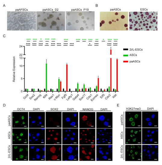 Conversion and characteristics of paASCs. (A) The morphological change during the conversion from paAFSCs to paASCs; D2: culture in ABCL medium for 2 days; P19: passage 19; scale bars: 100 µm. (B) PaASCs exhibited similar AP staining results to those of ESCs; scale bars: 100 µm. (C) RT-qPCR of key pluripotent genes, germ-layer-related genes, and X-chromosome-inactivation-related genes in 2i/L-ESCs, ASCs and paASCs. Error bars indicate three independent biological replicates (mean ± SD). * p < 0.05, ** p < 0.001, *** p < 0.0001. (D) Immunostaining for pluripotent markers OCT4, SOX2 and NANOG in 2i/L-ESCs, ASCs, and paASCs; scale bars: 50 µm. (E) Immunostaining for H3K27me3 in 2i/L-ESCs, ASCs, and paASCs. Scale bars: 50 µm.