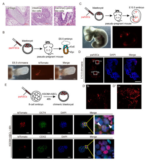 Developmental potential of paAFSCs and paASCs in vivo. (A) Teratoma derived from paASCs. The left panel shows a cartilage-like structure (mesoderm), the middle panel shows an intestinal-like structure (ectoderm), and the right panel shows a mammary gland-like structure (endoderm); scale bars: 100 µm. (B) The paAFSCs with tdTomato contributed to the extra-ectoderm of the E6.5 chimaera; scale bars: 100 µm. (C) The paASCs with tdTomato contributed to the fetus of the E10.5 chimaera. (D) Sections of the E10.5 chimaera were stained with the RFP expressed by paASCs. (D′) and (D″) mark the forebrain (fb) and caudal vertebra (cv) of fetus, respectively; scale bars: 1 mm. (E) Immunostaining for OCT4 and CDX2 of blastocysts which developed from 8-cell stage embryos with injected paASCs for 48 h of culturing in KA in vitro; scale bars: 50 µm. The white arrows pointed to the paASCs with tdTomato reporter also expressed OCT4.