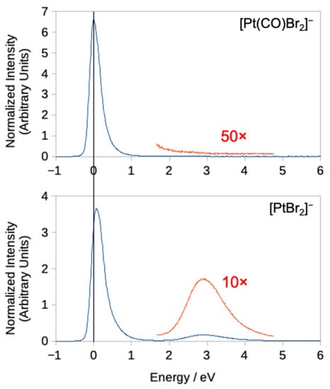 As is clear from Figure 2, the PESs for the formation of the anionic fragment [Pt(CO)Br2]− and [PtBr2]− lie entirely below the ground state of the neutral molecule in the range of the dissociative coordinate 1.4 to 4.2 Å. Thus, the survival probability of [Pt(CO)Br2]−, with respect to further CO loss, drops rapidly above the threshold. This, in turn, is reflected in the shift and broadening of the low-energy contribution for [Pt(CO)Br2]− as compared to PtBr2− and the lack of any [Pt(CO)Br2]− contribution through the higher lying resonance at around 3 eV.