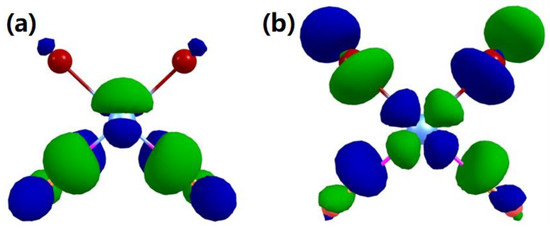 Isosurfaces of the frontier orbitals of the Pt(CO)2Br2 anion obtained with a contour value of 0.05. (a): SOMO. (b): SOMO+1.