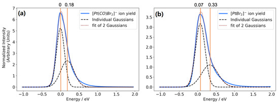Fit of two Gaussian functions to the [Pt(CO)Br2]− ion yield (a) and the [PtBr2]− ion yield (b). The first represents contributions from dissociation from the anionic ground state, while the latter represents these from the first excited anionic state.