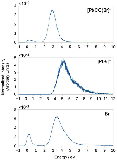 Finally, [PtBr]− is formed with an onset close to its threshold at 3.8 eV and a maximum at about 5 eV. This fragment, which is formed through the loss of three ligands, appears with low intensity, and we anticipate that it is formed through the high energy tail of the resonance (or resonances), contributing to the [PtBr2]−, [Pt(CO)Br]− and Br− formation at around 3 eV.