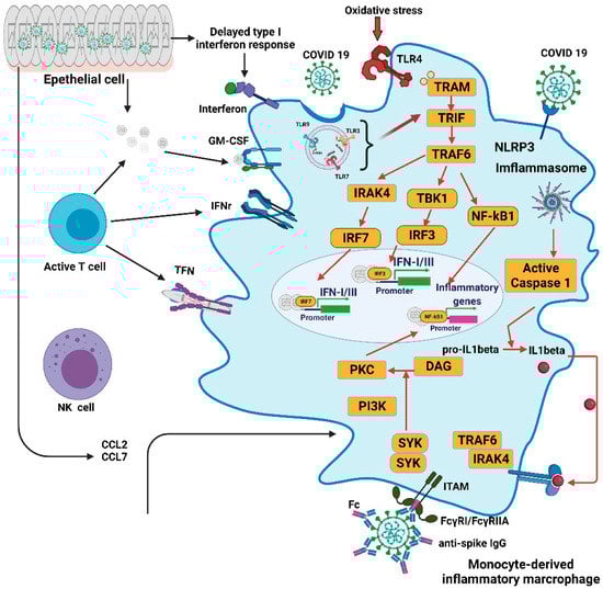 SARS-CoV-2 infection reveals the significant recruitment of immune monocytes/macrophages/neutrophils in the lung parenchyma. Pulmonary pathology indicates upregulated neutrophil and monocyte chemoattractants [,]. Pathological elucidation of infiltrating monocytes in the bronchoalveolar lavage (BAL) revealed the presence of vast monocytes with an inflammatory phenotype []. Proteomic analysis of the innate immune response pattern revealed that symptoms are rapidly followed by an influx of CD169+ monocytes and an abundance of IFN-γ+MCP-2+ expression. In the later stages of severe COVID-19, a persistent inflammatory phenotype with high levels of CCL3 and CCL4 is obtained. These are correlated with the re-emergence of CD16+ monocytes []. This kind of monocyte is a superior source of IL-6 and other dissimilar cytokines. Neutrophils have the ability to produce reactive oxygen species (SAR), and under oxidative stress, they may form extracellular neutrophil traps (NETs). These NETs are found in pulmonary and tracheal aspirations of patients with COVID-19 []. The production of ROS and NETs by neutrophils can aggravate the harmful response to infection and can aggravate the death of respiratory epithelial cells [,,].