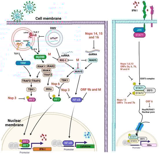 Coronavirus replication occurs in double-membraned vesicles (DMVs). Its replication can shield viral ssRNA and viral dsRNA, recognized by PRRs such as TLR3, TLR7, RIG-I, and MDA5. These PRRs activate the adaptors TRIF and MyD88, which are downstream of TLRs, and MAVS and TBK1, which are downstream of RIG-I and MDA5. These steps are the initiation of the type 1 interferon production pathway. IRF3, IRF7, or NFκB activation results in the signaling. These proteins can activate downstream genes. Then, the immune gene transcription, including proinflammatory cytokines and interferons, is upregulated. The right-side solid line indicates the IFN signaling, beginning with IFN-I binding IFNAR to initiate JAK/STAT signaling and the formation of the ISGF3 complex STAT1/STAT2/IRF9, which activates ISRE transcription. SARS-CoV-2-encoded proteins (shown in red) inhibit many aspects of these pathways, resulting in decreased type 1 interferon and dysregulated proinflammatory cytokine expression. Many of the SARS-CoV-2 interferon antagonists have been identified in vitro and in vivo (black) []. The immune evasion displayed by SARS-CoV-2 includes pathogen sensing, interferon production, and ISG functions. Viral proteins can block one or multiple critical signaling molecules. In the beginning, viruses change their nucleic acid structures to avoid binding by host receptors. Viral RNA is guanosine-capped and 5′ end methylated by SARS-CoV nonstructural components (nsp10, nsp14, nsp15, and nsp16), allowing the CoV to avoid the binding of host dsRNA binders [,]. These are critical mechanisms by which SARS-CoV escapes from host immunity. Viral proteins suppress key molecules in the recognition of viral pathogens; for example, the SARS-CoV N protein and M protein can block RIG-I activation. In addition, other viral components suppress different signaling cascades for the induction of interferons; SARS-CoV-2 ORF9b interacts with MAVS in mitochondria. The endoplasmic reticulum STING signaling is stopped by the SARS-CoV protein nsp3. SARS-CoV employs additional signaling interruption mechanisms. SARS-CoV-2 nsp13 and nsp15 prevent TBK-1 and IRF3 activation. Viral proteins can suppress the function of transcriptional factors for the induction of IFNs or inflammatory cytokines. Furthermore, the SARS-CoV-2 nsp1 protein inhibits host gene expression by promoting the degradation of mRNA degradation and suppressing protein synthesis, including molecules included in host innate immune functions. The right panel shows how viral proteins block interferon signaling. Finally, SARS-CoV-2 Nsp3 is responsible for the inhibition of host innate immune responses through post-translational modification by ISG15.