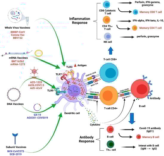 DNA vaccines such as the AstraZeneca Oxford vaccine and the Johnson and Johnson vaccine use adenoviral vectors to incorporate the SARS-CoV-2 spike protein gene sequence in this viral vector []. The DNA is injected into the body to generate immunity against SARS-CoV2. The DNA molecule injected into the body can be taken up by plasmacytoid dendritic cells and macrophages. These antigen-presenting cells then present the antigen to CD4 T cells to trigger adaptive immunity. The difference between DNA vaccines and RNA vaccines is that DNA uses Toll-like receptor 9 (TLR9) as the cellular receptor to generate cellular signaling to trigger IRF7 to activate type 1 interferons, including IFNα and IFNβ. When DNA is transcribed into RNA, Toll-like receptor 3 and Toll-like receptor 7 are also used to recognize double- or single-stranded RNA molecules. The process is similar to that of mRNA vaccines in the generation of antiviral immunity. To trigger successful host immunity, the dendritic cells first migrate to nearby lymph nodes. With the incorporation of follicular dendritic cells and lymphoid tissue inducer cells, follicular helper T cells allow germinal center B-cell isotype switching from IgM to IgG to generate memory B cells and effector B cells.