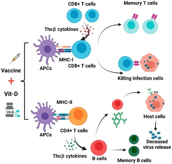 The use of vitamin D supplements may improve immune responses from different COVID-19 vaccines. As shown in Figure 4, antigen-presenting cells (APCs) treat the vaccine as an antigen and then present it to CD8+ T and CD4+ T cells. CD8+ T lymphocytes can be activated by THαβ cytokines and acquire the capacity to attack infected cells. This process could be complemented with appropriate vitamin D supplementation. THαβ cytokines can aid in the differentiation of B cells. The activated B cells are able to produce NAbs. Vit-D can also improve antibody generation in a T-cell-dependent B-cell manner. However, unbalanced immune responses can lead to lung immunopathology induced by aberrant ADE, and this may also be mitigated by treatment using vit-D [,].