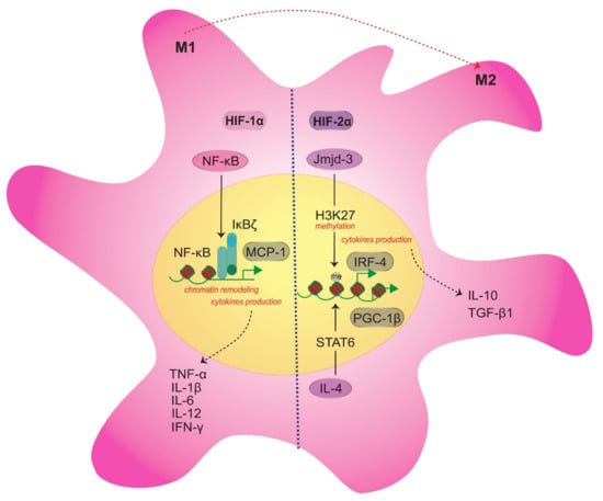 Macrophage intracellular reprogramming during polarization. Balanced switching of M1/M2 macrophage action is crucial. Both the HIF-1α and HIF-2α subunits are essential to maintain the NF-κB level. However, due to the incongruent roles of HIF-2α, the part of the phenotypic switch between HIF-1α and HIF-2α in M1/M2 macrophages remains uncertain. M1 macrophage polarization is NF-κB-independent. NF-κB mediates the IkBζ recruitment to target promoter and acts as a transcriptional coactivator for chromatin remodeling that regulates the CCL2 (MCP-1) gene, thus producing cytokines such as TNF-α, IL-1β, IL-6, IL-12, and IFN-γ. M2 macrophages upon IL-4 stimulation activate STAT6, which then induces PGC-1β that is essential for the M2 macrophage profile and is characterized by IL-10 and TGF-β1 expression. Meanwhile, Jmjd-3, a histone 3 Lys27 (H3K27) demethylase that directly targets IRF-4, is crucial for M2 macrophages.