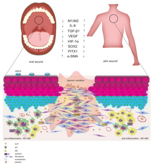 Role of metabolic reprogramming in oral wound healing under hypoxic conditions. Oral mucosal wounds heal faster than skin wounds, although having similar wound healing stages. The saliva is considered one factor that facilitates rapid mucosal wound closure by expressing secretory IgA. However, the essential cytokines, chemokines, growth factors, and protease inhibitors are interrelated and inseparable. Fewer M1/M2 macrophages and lower cytokine production (IL-6 and TGF-β1) during oral mucosal wound healing were observed. Lower VEGF expression found in the oral wound may be due to a decreased level of HIF-1α gene expression level, while higher expression levels of SOX2 and PITX1 followed by the increased level of α-SMA expression lead to acceleration and less scar tissue formation in oral wounds than in skin wounds. Wound S1P/HIF gradient cause S1P/HIF to act as pro- or anti-inflammatory agents for inflammatory cells such as M1/M2 macrophages.