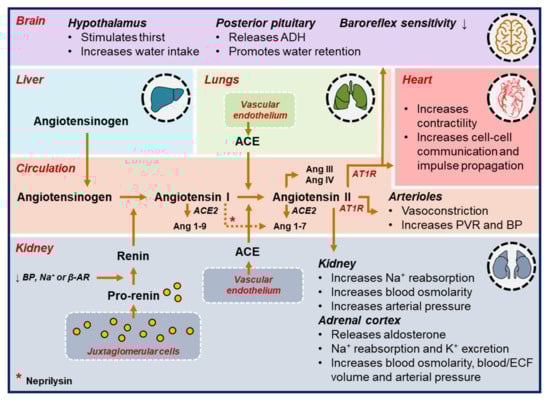 The renin-angiotensin-aldosterone activation cascade. Several stimuli including a decrease in blood pressure (BP), reduced sodium (Na+) levels, or activation of the autonomic nervous system promote the conversion of pro-renin into renin, which then cleaves angiotensinogen into angiotensin I. Subsequently, angiotensin I is converted into angiotensin II and binds to angiotensin receptors in brain, heart, kidney, adrenal cortex and arterioles to retain water, reabsorb sodium and initiate vasoconstriction. (ACE = angiotensin-converting enzyme; ADH = antidiuretic hormone; Ang = angiotensin; AT1R = angiotensin receptor type 1; ECF = extracellular fluid; K+ = potassium; Na+ = sodium; PVR = peripheral vascular resistance; β-AR = β-adrenergic receptor activation).
