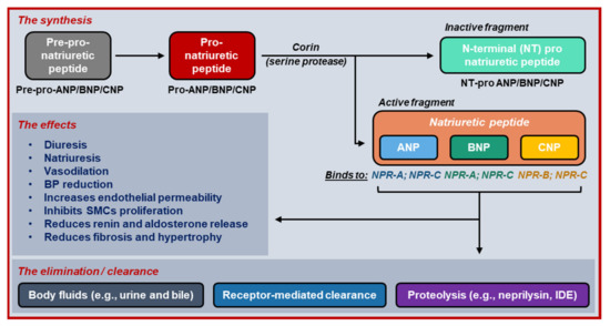 NPs similarly play an important role in cardiovascular homeostasis [2,3,4]. At least three major subtypes of NPs exist: atrial, brain and C-type NPs (i.e., ANP, BNP and CNP), which are primarily synthesized in, respectively, the atria, ventricles, and vascular endothelium (e.g., in central nervous system and HF myocardium) [2,5]. Initially, these NPs are synthesized and secreted as inactive precursors (in a pre-pro form). During prolonged activation of the RAAS and SNS in HF, the pre-pro-NP is converted into pro-NP, which is subsequently cleaved into active NP, and inactive N-terminal (NT) pro-NP fragments [3]. The active fragments bind to NP receptors (NPRs) to exert their broad array of functions, including natriuresis, diuresis and vasodilation, lowering blood pressure and elevating vascular permeability (Figure 2). Active NPs also inhibit smooth muscle-cell proliferation and the release of renin and aldosterone, thereby reducing the HF-associated structural remodeling [2]. NPs are inactivated by body fluid-mediated excretion (e.g., urine and bile), NPR-mediated internalization (via NP clearance receptors NPR-C and NPR-C3), and proteolysis. Neprilysin is the primary membrane-bound proteolytic enzyme responsible for NP degradation. It is predominantly expressed in the kidney and also digests other vessel-modulating substances (e.g., substance-P, bradykinin, endothelin-1 and angiotensin II), as well as converting angiotensin I into vasodilation-promoting angiotensin 1–7 [2]. Under physiological conditions, the concentration of NPs is inversely correlated with RAAS activation, while in HF, this correlation is positive, with NP levels proportional to the cardiac injury, presumably acting as a compensatory, self-protective mechanism [2].