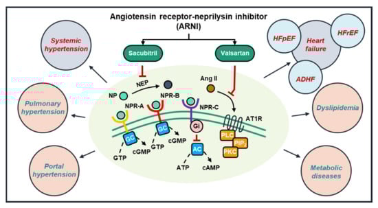 In rats with right ventricular (RV) pressure overload and pulmonary hypertension, sacubitril/valsartan improved RV biomechanical properties and prevented RV structural remodeling [29,30]. Meanwhile, in portal hypertensive rats, sacubitril/valsartan lowered portal pressure, downregulated hepatic endothelin-1 protein expression, and reduced mean arterial pressure and systemic vascular resistance [31]. Interestingly, sacubitril/valsartan was not superior to valsartan alone in reducing blood pressure, aortic atherosclerosis and abdominal aortic aneurysm in angiotensin II-infused low-density-lipoprotein receptor-deficient mice [32], perhaps because exogenous angiotensin II was the major pathophysiological trigger in this model. Sacubitril/valsartan also significantly lowered plasma triglycerides in HFpEF patients, especially in those with higher baseline triglycerides, while modestly increasing low- and high-density lipoprotein cholesterols [33]. Moreover, one-time sacubitril/valsartan elevated the post-prandial glucagon in healthy individuals, while over 8 weeks, the drug increased fasting glucagon in obese hypertensive individuals, without changes in fasting glucose or amino acids [34], suggesting a potential role of ARNI in modulating dyslipidemia and metabolic diseases (Figure 3).