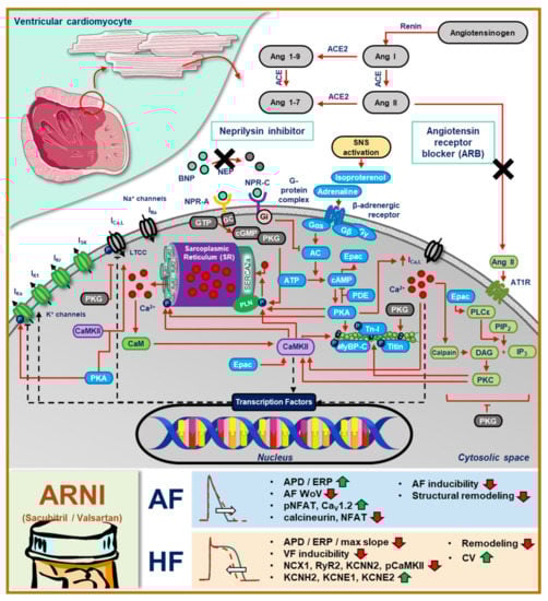 The overview of calcium-dependent signaling cascades in ventricular cardiomyocytes and the beneficial effects of ARNI in modulating cardiac electrophysiology. (AC = adenylyl cyclase; ACE = angiotensin converting enzyme; Ang II = angiotensin II; APD = action potential duration; ATP = adenosine triphosphate; CaM = calmodulin; CaMKII = calmodulin-dependent protein kinase II; cAMP = cyclic adenosine monophosphate; CV = conduction velocity; DAG = diacyl glycerol; ERP = effective refractory period; GC = guanylyl cyclase; IL = interleukin; IP3 = inositol trisphosphate; MyBP-C = myosin binding protein C; NEP = neprilysin; NFAT = nuclear factor of activated T-cells; NPR = natriuretic peptide receptor; PDE = phosphodiesterase; PIP2 = phosphatidylinositol bisphosphate; PKA = protein kinase A; PKC = protein kinase C; PKG = protein kinase G; PLC = phospholipase C; Tn-I = troponin I; WoV = window of vulnerability).