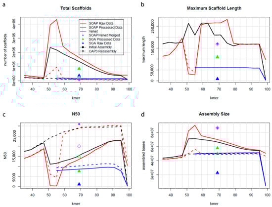 Plots representing total scaffolds (a), maximum scaffold length (b), N50 statistics (c), and assembly size (d) of P. brassicum P1 genome. The quality of the completed assembled genome was performed using QUAST.