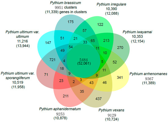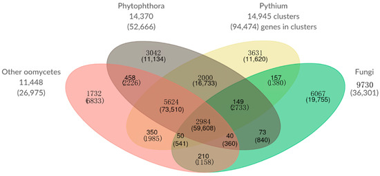 Comparison of orthologous gene clusters of Pythium species, Phytophthora species, Fungi, and other oomycetes. The number of gene clusters and total number of genes contained within those clusters (in parentheses) is displayed for each overlapping category. The numbers outside the Venn diagram show the total number of gene clusters (and genes) in each set.