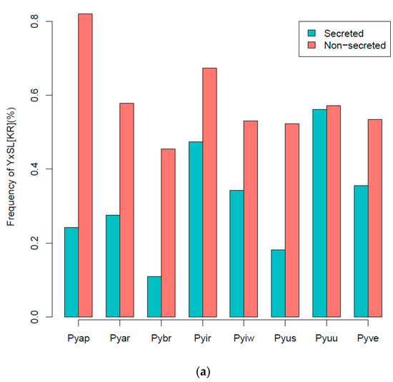 - YxSL[KR] effectors: P. brassicum P1 had much smaller proportions of the YxSL sequence motif in both secreted and non-secreted proteins, relative to other Pythium species. Pythium ultimum var. ultimum had the highest proportion of secreted proteins with YxSL motifs, while P. aphanidermatum had the highest proportion of non-secreted proteins with YxSL motifs. Pythium brassicum P1 had the lowest proportion of proteins with YxSL motifs in both secreted and non-secreted proteins (Figure 4a,b).