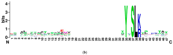 Figure 4. Percentage frequency of secreted and non-secreted YxSL[RK] effector proteins in P. brassicum P1 (Pybr), P. aphanidermatum (Pyap), P. arrhenomanes (Pyar), P. irregulare (Pyir), P. iwayamai (Pyiw), P. ultimum var. sporangiiferum (Pyus), P. ultimum var. ultimum (Pyuu), and P. vexans (Pyve) (a), and the typical architecture of a YxSL(RK) effector candidate inferred from 51 Pythium YxSL(RK) protein motifs (b). The consensus sequence pattern of YxSL(RK) motif was computed using WebLogo (available online: http://weblogo.berkeley.edu/logo.cgi) (accessed on 16 February 2021). The larger the letter, the more conserved the amino acid site. The numbers in the sequence logo refer to the corresponding positions in the alignment and thus differ from the average position of the motifs in the proteins. - (ii).