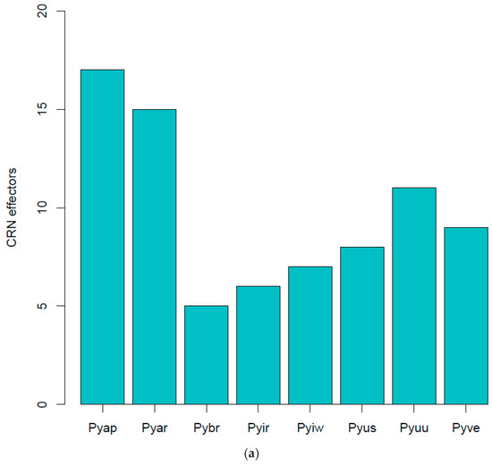 - CRN effectors: The Crinkler (crn) gene family encodes a large class of secreted proteins that share a conserved amino-terminal LFLAK domain involved in host translocation in Phytophthora spp. [23]. As seen with YxSL effectors, Pythium brassicum P1 had the fewest CRN effectors of all the Pythium species (Figure 5).