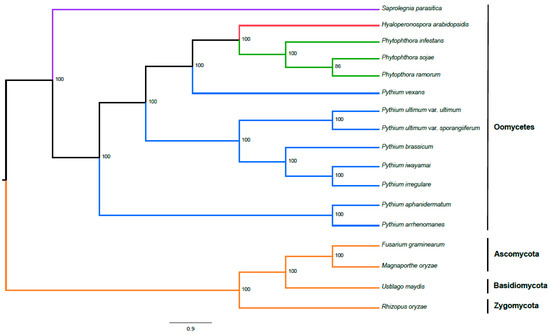 A phylogeny of 13 oomycete species (8 Pythium, 3 Phytophthora, Hyaloperonospora arabidopsidis, and Saprolegnia parasitica) and four fungal outgroup species (Magnaporthe oryzae, Fusarium graminearum, Rhizopus oryzae, and Ustilago maydis) was constructed with RAxML [31]. Multiple sequence alignments of 341 single copy orthologs present in every genome, as determined by OrthoMCL [25], were aligned using MAFFT [39] and then passed to RAxML, which was run using the GAMMA model of rate heterogeneity and the LG model of substitution. One thousand bootstrap simulations were run, and the final tree was visualized using FigTree (available online: http://tree.bio.ed.ac.uk/software/figtree/) (accessed on 15 March 2021).