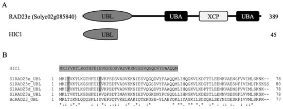 A prey Y2H library generated by pooling the cDNAs from Lso-uninfected, and LsoB-infected tomato leaves were screened using the HPE1 protein from LsoB as bait. After screening up to 2 × 106 individual yeast clones, we identified 16 clones having three different in-frame insert sequences. Of these, 14 clones had identical coding sequences, which we refer to here as HPE1 Interacting Clone 1 (HIC1). BLASTx analysis against the tomato reference genome (Solanum lycopersicum iTAG2.4) revealed that HIC1 corresponds to the first 45 amino acids of Solyc02g085840 (Figure 1A). Solyc02g085840 is RAD23e, a member of the RAD23 protein family that includes three other tomato proteins, RAD23a (Solyc03g117780), RAD23c (Solyc04g007120), and RAD23d (Solyc02g063130) []. HIC1 encodes the N-terminal ubiquitin-like domain (UBL) of RAD23e (Figure 1B), a domain that is assumed to interact with the 26S proteasome complex []. Because RAD23 serves as the principal shuttle protein for ubiquitinated targets to 26S proteasome, and is conserved in eukaryote species, we hypothesized that a homologous Rad23 gene might exist in psyllids. Therefore, we datamined the B. cockerelli transcriptome and identified a RAD23 homolog, which shared 51%, 47%, 51%, and 50% of similarity with SlRAD23a, SlRAD23c, SlRAD23d, and SlRAD23e, respectively (Figure 1B) [].