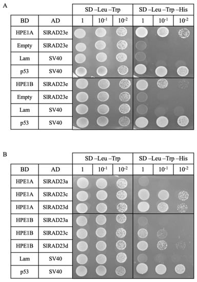For directed Y2H, full-length SlRad23 and Bactericera cockerelli Rad23 coding sequences were cloned into the GADT7 vectors as prey, and the coding sequence of the mature HPE1A protein was cloned into pGBKT7 as bait. The desired pair of prey and bait constructs were cotransformed into Y2H Gold yeast and plated on SD−Leu−Trp (DDO) medium. Yeast clones with paired constructs were cultured, and 10 μL droplets of the culture dilutions were transferred onto DDO, SD−Leu−Trp−His (TDO), and QDO with a supplement of 40 μg/mL X-alpha-Gal.