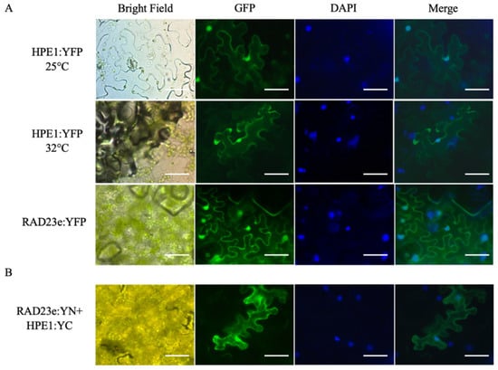 (A) HPE1B and RAD23e colocalized at the nuclei and cytosol of Nicotiana benthamiana epidermal cells. Upper panel: HPE1B:YFP:HA at 25 °C; Middle panel: HPE1B:YFP:HA at 32 °C; Lower panel: SlRAD23e:YFP:HA at 25 °C. Scale bar = 50 µm (B) Bi-molecule fluorescence complementation (BiFC) analysis of HPE1B and RAD23e interaction in N. benthamiana epidermal cells infiltrated with a 1:1 ratio of agrobacteria containing HPE1B-YC and RAD23e-YN. Images were taken between 48–60 h postinfiltration.