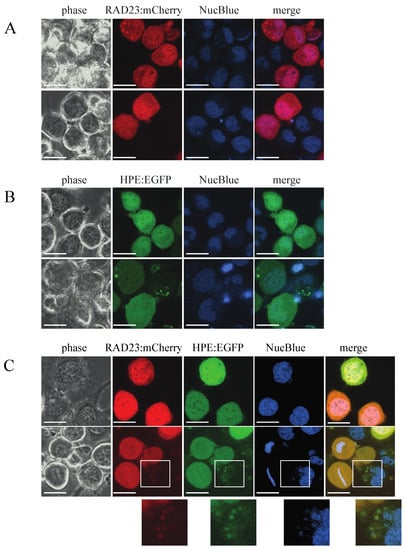 2.2. HPE1B Colocalizes and Interacts with SlRAD23e in Both Plant Nuclei and Cytosol
