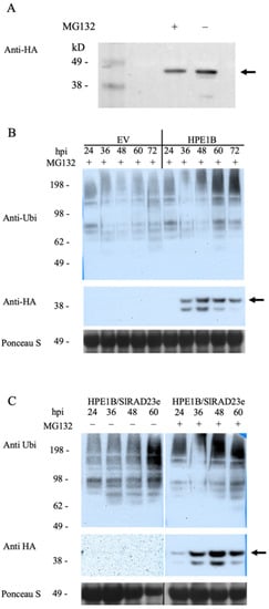 Next, we examined whether HPE1B expression affected the function of general ubiquitination by binding to the shuttle protein, RAD23, in plant cells. While no ubiquitination of the HPE1B fusion protein was observed as described above, the HPE1B expressing samples consistently showed a higher accumulation of other ubiquitinated proteins when compared with the control samples expressing no fusion protein (Empty vector) (Figure 5B). Moreover, these ubiquitinated proteins continued to accumulate at later time points even after transient expression of HPE1B had peaked at 48 h postinfection (hpi), suggesting that the degradation of HPE1B could be involved in the accumulation of ubiquitinated proteins.