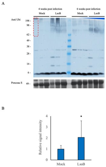 Immunoblot of tomato leaves at 4 weeks and 6 weeks post-LsoB infection. (A) Plants were infested with either Lso-free (Mock) or LsoB-infected (LsoB) adult psyllids. The dotted box indicates the range (60–200 kDa) used to quantify the ubiquitin signal intensity in (B). Error bars indicate the standard deviation (SD). Asterisk indicates significant difference from Mock group by Student’s t-test (p < 0.05). The experiment was replicated three times, each with three plants in each group. The Western blot was repeated at least twice per sample, each showing similar results.