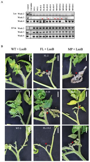 For Lso infection, five-week-old tomato seedlings were used, and four adult psyllids from the desired population were mesh-bagged with a lower-tier leaf for seven days before being removed. Each infection experiment had at least three plants, and the experiments were repeated at least three times.