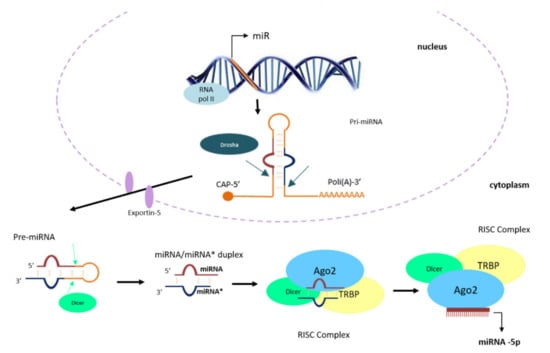 The biogenesis of miRNA begins within the nucleus where the RNA polymerase II synthesizes a primary transcript, called pri-miRNA which undergoes several maturation processes. Pri-miRNAs have a length of about 100 nucleotides and can be transcribed by their promoters, located in intragenic (mostly introns but also exons) and intergenic regions [,]. Pri-miRNAs are characterized by inverted and close repetitions that pair forming a hairpin structure (Figure 1).