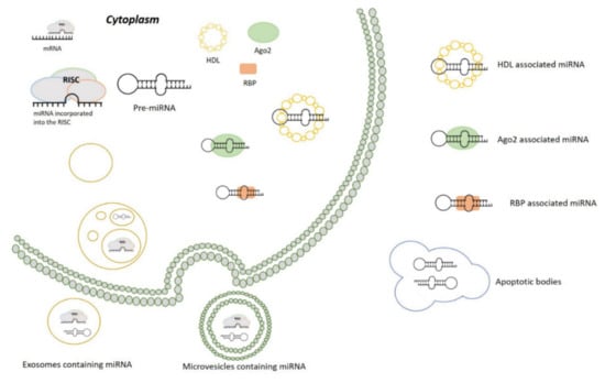 microRNA release mechanisms. miRNAs can be released into the extracellular space through several mechanisms: both pre-miRNAs and mature miRNAs, loaded into the RISC complex, can be incorporated into exosomes or microvesicles and secreted from the donor cell. Circulating miRNAs can also be derived from apoptotic bodies. Moreover, miRNA can be stable in biological fluids in association with RNA-binding proteins (RBP), Ago2 or HDL.