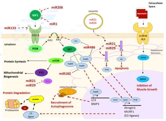 Schematic representation of miRNAs involved in the regulation of atrophy and protein degradation pathways in skeletal muscle tissue. Insulin-like growth factor 1 (IGF-1) activates the Akt/mTOR signaling pathway, responsible for protein synthesis. Akt inhibits the degradation of proteins by keeping inactive in the cytoplasm transcription factors members of the forkhead box protein O (FoxO) family (FoxO1, FoxO3 and FoxO4), which otherwise migrate in the nucleus and promote the transcription of the E3 ligases (Atrogin1 and MuRF1), responsible for the protein degradation mediated by the system of the ubiquitin proteasome. In the nucleus FoxO3 is also able to promote the transcription of microtubule-associated protein 1A/1B-light chain 3 (LC3) and BCL2 Interacting Protein 3 (BNIP3) which once in the cytoplasm localize on the outer membrane of the mitochondria, promoting mitophagy through the recruitment of the autophagosome. The Akt/mTOR pathway is also able to promote the activation of the factor Yin Yang 1 (YY1) which, associating with peroxisome proliferator activated receptor gamma coactivator 1 alpha (PGC1α), induces mitochondrial biogenesis. Akt activation is inhibited by phosphatase and tensin homolog (PTEN) which inhibits the phosphorylation of PIP2 to PIP3. Several in vitro and in vivo studies have shown that elevated circulating levels of miR-1, miR-133a/b and miR-206 appear to negatively regulate the IGF-1/Akt/mTOR pathway, by targeting positive regulators IGF-1 and IGF1-receptor (IGF-1R) thus promoting muscle wasting. On the contrary, miR-486 and miR-182 promote protein synthesis, by targeting negative regulators of this signaling pathway (PTEN, FoxO1-3). miR-21 and miR-29 contained in the exosomes can penetrate the muscle fiber and activating the TLR7/8 located on the endoplasmic reticulum promoting i) the activation of JNK which induces apoptosis of the muscle fiber and ii) NF-kB which, migrating in the nucleus, promotes the transcription of Atrogin1 and MuRF1, responsible for protein degradation. miR21 and miR29 in skeletal muscle tissue are also able to negatively regulate mitochondrial biogenesis by targeting YY1. Finally, the signaling pathway induced by myostatin activates SMADs (2-3-4) which, by moving to the nucleus, inhibit muscle growth. Dashed arrows indicate the pathways that lead to muscle wasting. Dashed lines indicate the inhibitory function of miRNAs in skeletal muscle tissue. Black arrows indicate the pathways involved in muscle homeostasis.
