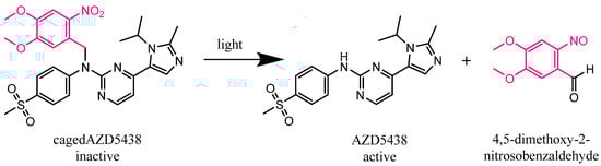 Expected photolysis reaction of the inactive kinase inhibitor AZD5438 caged with the photoremovable protecting group 4,5-dimethoxy-2-nitrobenzyl (DMNB) (cagedAZD5438) to the active AZD5438 and the separated protection group according to Klán et al. [].
