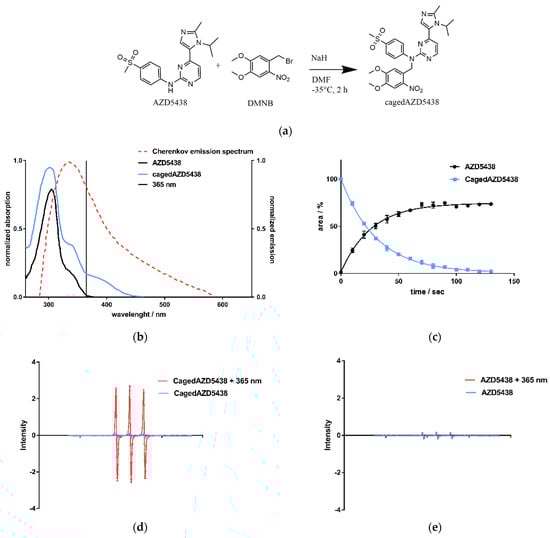 Having demonstrated the generation of CR by the radionuclides 18F, 68Ga, and 90Y as a side-product, we next investigated whether this process could activate a photoresponsive compound. We selected the 4,5-dimethoxy-2-nitrobenzyl (DMNB) caged AZD5438 (cagedAZD5438) as a novel model compound based on the emission spectrum of the CR and the strong absorption of cagedAZD5438 within the range of 300–400 nm (Figure 3b). The DMNB group was already investigated by our group in connection with the central pharmacophore N-phenylpyrimidine-2-amine, a scaffold of many kinase inhibitors, including AZD5438 []. Molecular modeling of the X-ray-defined ligand complex of AZD5438 in CDK2 with cyclin E1 (pdb 4FKO) suggested the NH function to be suitable for caging. Herein, due to steric conflicts of the caging moiety, no plausible binding mode for cagedAZD5438 in CDK2 could be determined (see Figure S1) [].