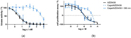 Next, we aimed to test the uncaging of cagedAZD5438 in vitro. For this purpose, we initially tested cagedAZD5438 in an enzymatic CDK2/cyclin E1 assay and in a cell proliferation assay under controlled light conditions. In the enzymatic CDK2/cyclin E1 assay, we determined AZD5438 to be highly active with an IC50 value of 2.8 nM, which is in the same range as the reference data (IC50 = 6 nM) []. In contrast, cagedAZD5438 proved to be much less active without irradiation (IC50 = 4798 nM). When irradiating the assay containing cagedAZD5438 with 365 nm, the biological activity on CDK2 could be restored, resulting in an IC50 value of 5.6 nM (Figure 4a) and achieving a photopharmacological factor of 850 (unirradiated vs. irradiated). Similar results were obtained in the cell proliferation assay using Panc89 cells with resazurin as a read-out. Here, cagedAZD5438 was determined to be biologically inactive with an IC50 value >10 μM (Figure 4b). Again, after irradiation with 365 nm, the biological potency of AZD5438 was fully restored, resulting in an IC50 value of 0.5 μM (reference AZD5438 IC50 = 0.8 μM). Taken together, in both the kinase and the cell assay, we could demonstrate a clear photoresponsive effect for cagedAZD5438, suggesting this compound to be a suitable model system for further experiments involving the radionuclides 18F, 68Ga, and 90Y and for particle accelerator assays (see SI Section 2.8).