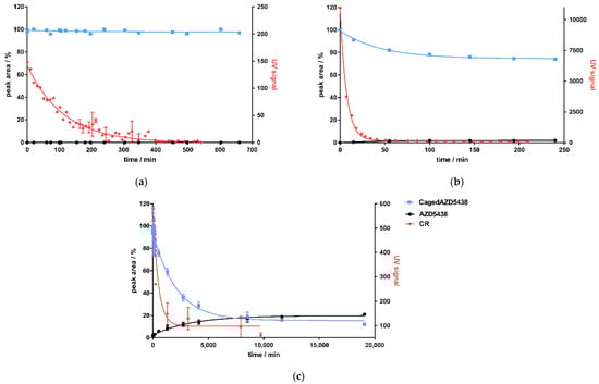 Correlation of CR detected by the KK method as UV signal (red dots) and uncaging of cagedAZD5438 (blue line) by HPLC analysis to yield uncaged AZD5438 (black) for 3 isotopes: (a) 18Fluor, (b) 68Gallium, and (c) 90Yttrium. All curves are fitted with one-phase decay.