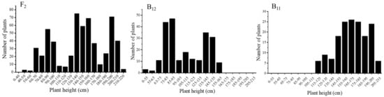Distribution of plant height in the F2 population and backcrosses. F2 population (left) derived from the cross of ndf-2 and 3529. B12 (middle) and B11 (right) derived from the backcross of F1 (ndf-2 × 3529) with ndf-2 and 3529, respectively.